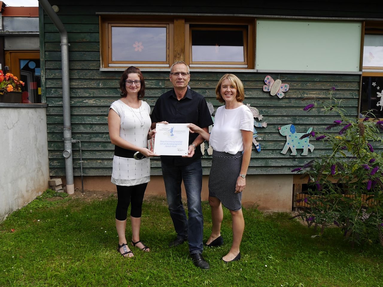 Bei der Übergabe der Plakette erfreuen (sich im Bild v.l.n.r.), die zusätzliche Fachkraft Marèn Laub, der Bürgermeister der Gemeinde Werther Hans Jürgen Weidt und die Kita Leiterin Beanke Juch.