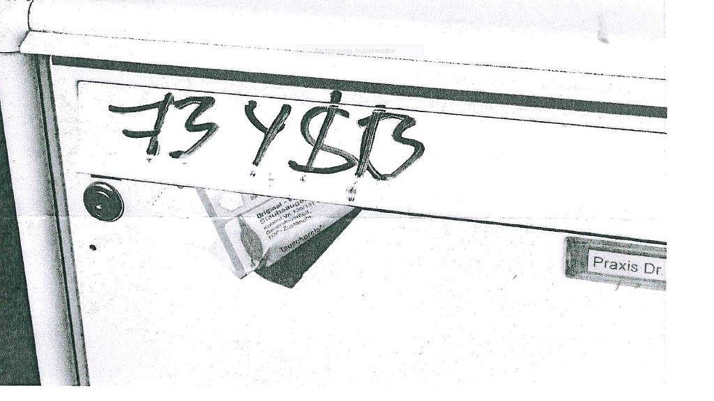 Mit den gleichen Schriftzügen wurde in der Nacht vom 30. Juli zum 31. Juli der Briefkasten einer Arztpraxis beschmiert. Die Praxis befindet sich ebenfalls in der Stolberger Straße.