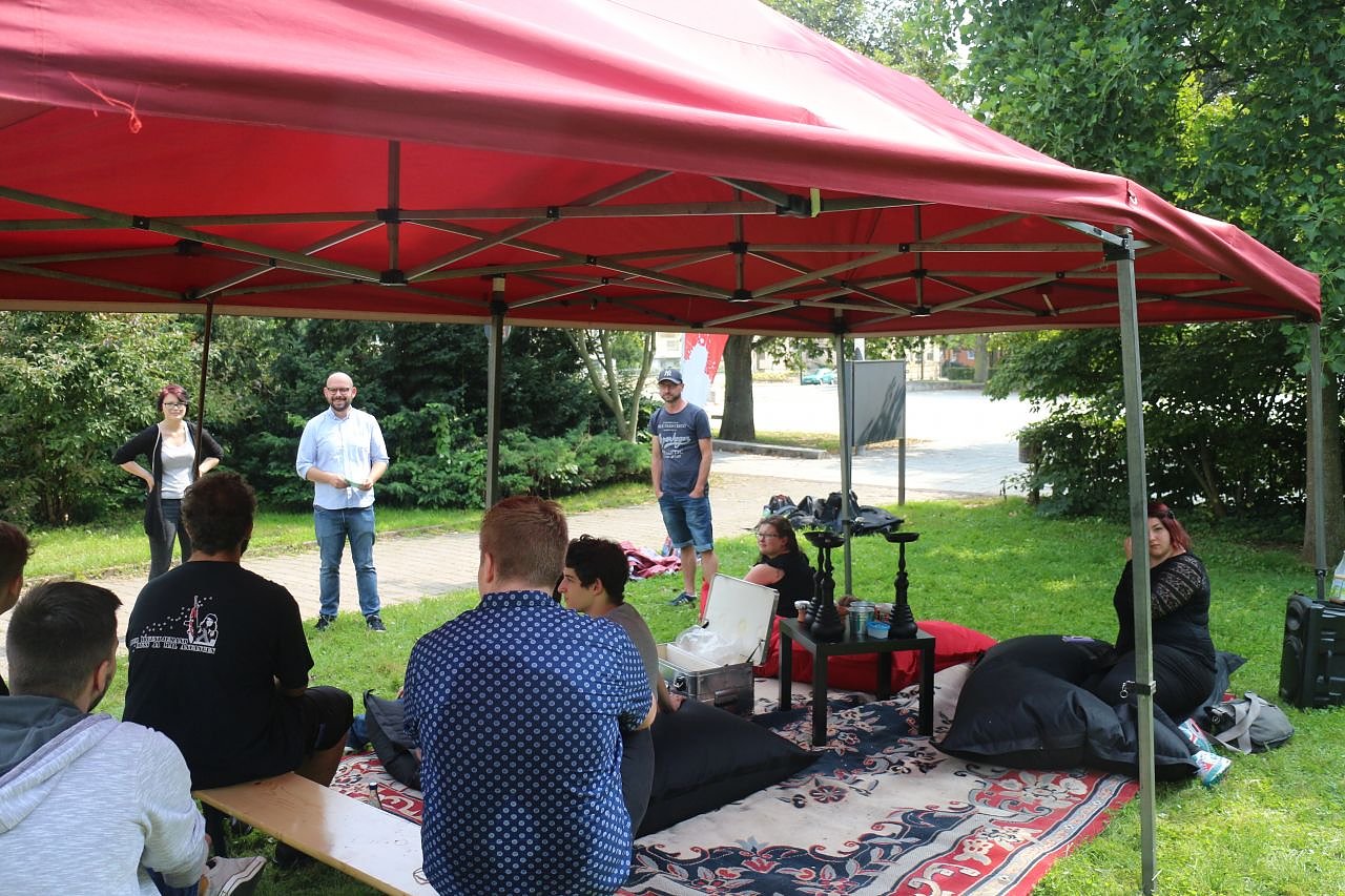 In der Promenade ging es am Nachmittag los. Wie sie die Parks nutzen würden, fragte Mohr sein Publikum und brachte Möglichkeiten ins Spiel, mehr Leben auf Nordhausens Grünflächen zu bekommen, etwa durch die Einrichtung öffentlicher Grillplätze. Weiter vor dem Theater, ob man wisse, wie es um die Theatersanierung stehe? Auf der weiteren Agenda standen: Elektro-Mobilität - hier sei neben Car-sharing auch "Bike-Sharing" eine Möglichkeit, meinte Mohr. Ein Bürgerhaushalt - bei verschiedenen freiwilligen Ausgaben und Pflichtaufgaben sollen die Bürger entscheiden können, etwa wenn es darum geht, welche Straße oder Gehweg saniert werden soll, entsprechende Beispiele kenne er aus Berliner Stadtteilen, so der Kandidat der Linken. Öffentliches WLAN - die Störerhaftung ist gefallen, freier Internet-Zugang auf öffentlichen Plätzen wie vor der Bibliothek oder dem Bahnhof sei kein Problem mehr.