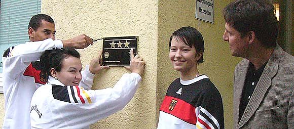 Heute ließen die Stubbes es mit sportlicher Hilfe am Apartmenthaus in Sülzhayn anbringen. Die Unterstützung kam von der Juniorenweltmeisterin im Kugelstoßen des Jahrgangs 2000, Kathlen Kluge, der amtierenden Juniorenweltmeisterin im Speerwurf, Vivian Zimmer sowie dem Dritten der Juniorenweltmeisterschaften im Mehrkampf, Norman Müller. Alle drei trainieren bei denn Halleschen Leichtathletikfreunden und absolvieren mit 21 weiteren Sportlern sowie Betreuern derzeit ein Trainingslager in Sülzhayn.