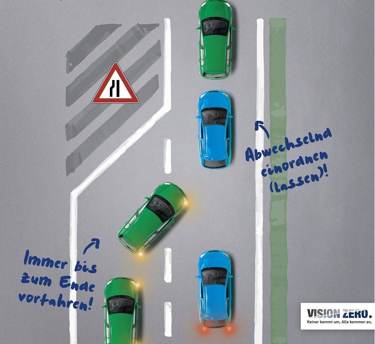 Die richtige Umsetzung des Reißverschlussfahrens ist eines der zehn Plakatmotive der Serie Wie war das noch mal? des DVR und des VDSI Verband für Sicherheit, Gesundheit und Umweltschutz bei der Arbeit. Die Serie soll zum sicheren Verhalten im Straßenverkehr beitragen und ist eingebettet in die Sicherheitsstrategie Vision Zero. Deren Ziel: Kein Mensch soll im Straßenverkehr oder bei der Arbeit getötet oder so schwer verletzt werden, dass er lebenslange Schäden davonträgt.