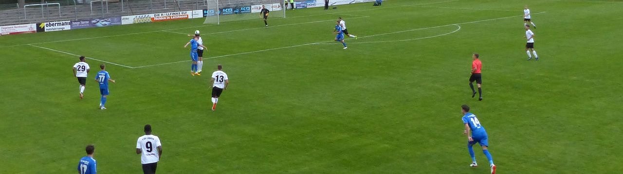 1. Minute: Wacker in Blau, die Gäste in Weiß-Schwarz. Wir haben Anstoß.