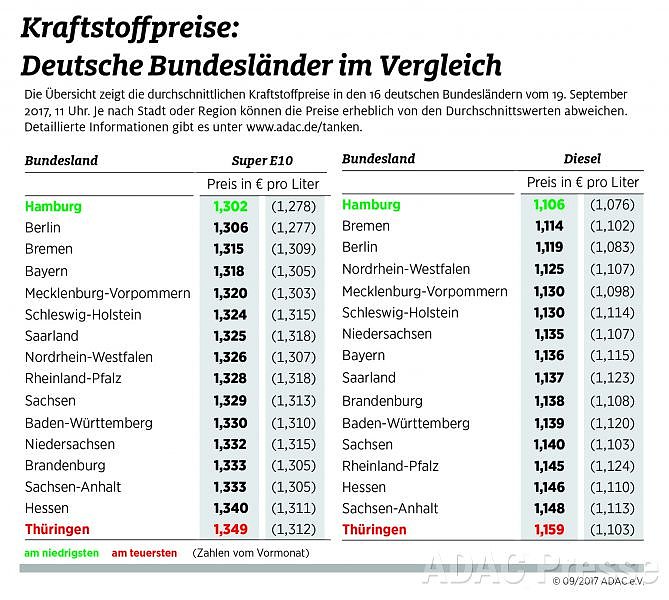 Autor: redLaut ADAC ist Hamburg bei beiden Kraftstoffsorten Spitzenreiter: Für einen Liter Super E10 muss man in der Hansestadt 1,302 Euro bezahlen, auf Platz zwei folgt Berlin mit 1,306 Euro, Dritter ist Bremen mit 1,315 Euro.