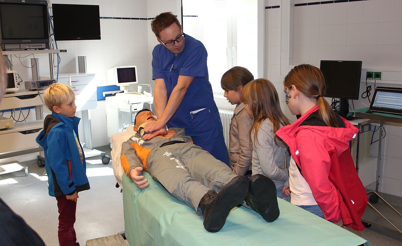 Um das nun erworbene theoretische Wissen praktisch anwendbar zu machen, wurden den Interessierten vielfältige Angebote im Bereich der gesamten Klinik geboten. Zum einen konnte man sich bei den halbstündlichen Führungen mit dem Krankenhaus und seinen Behandlungen vertraut machen, zum anderen bekam man in speziellen Bereichen wie der Sonografie an Hand einer praktischen Vorführung am Mensch ärztlich erläuterte Einblicke. Ein Magnet war auch der Alterssimulationsanzug mit dem man sich auf einen Schlag 40 Jahre älter fühlen konnte. Ein weiterer Anziehungspunkt war die Bronchoskopie-Abteilung. Hier wurde an einem Modell veranschaulicht, welche Bilder der Arzt bei einer Lungenspiegelung zu sehen bekommt.