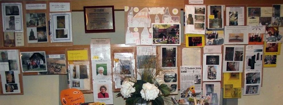 Gabi Markrinus trug alles selbst zusammen, was auf einem Büchertisch zu sehen ist. Besondere Aufmerksamkeit erfährt eine Wandtafel 20 Jahre Kirchenbauverein. Sie gibt Auskunft über die viel hundertjährige Geschichte der Kirche: über ihre Entstehung, ihren Verfall und über die Widerauferstehung. Geschichte schreibt hier der Kirchenbauverein. Genannt werden uns das Ehepaar Bernd und Anni Siegmund, Pfarrer Gerstenberger, Jochen Bühling.Gerettet vor dem Verfall