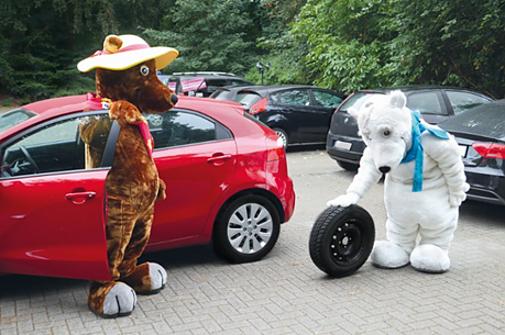 Eisbär Profilius macht Braunbärin Profilia auf den bevorstehenden Wechsel von Sommer- auf Winterreifen aufmerksam, denn es gilt die situative Winterreifenpflicht.Kaum ein Autofahrer ist sich aber bewusst, dass Reifen regelmäßig überprüft werden sollten, denn Reifendruck, Profiltiefe, Alter und sichtbare Mängel haben erheblichen Einfluss auf die Fahrstabilität und den Bremsweg. Bei der bundesweiten Wash & Check-Aktion der Initiative Reifenqualität – Ich fahr’ auf Nummer sicher! des Deutschen Verkehrssicherheitsrates (DVR) und seiner Partner bekommen Autofahrer wichtige Expertentipps zum Thema.