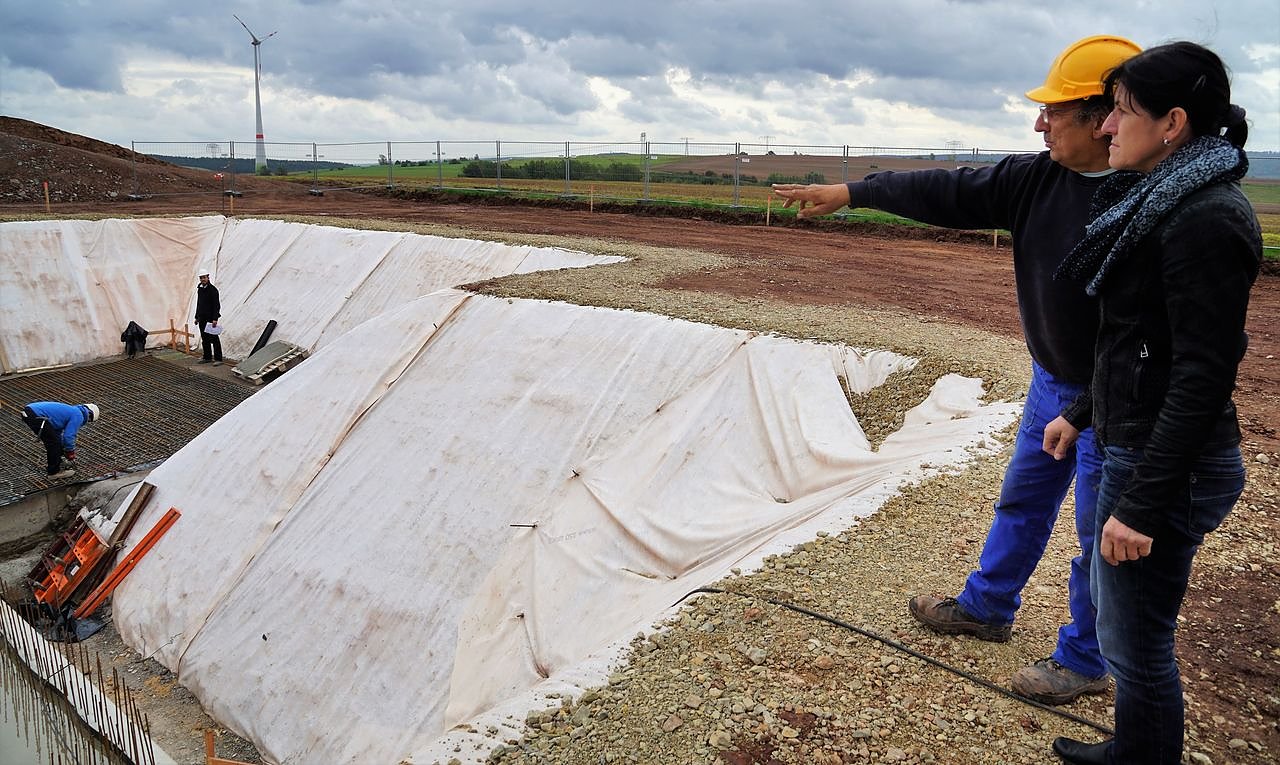 Wasserverband-Chefin Carmen Lis an der Baugrube des neuen Hochbehälters im Gespräch mit Polier Achim Willert von der Firma Umwelttechnik & Wasserbau Jena. Zusätzlich zum neuen Hochbehälter werden in Wolkramshausen-Bahnhof eine neue Druckerhöhungsanlage und von dort in Richtung Nentzelsrode eine etwa drei Kilometer lange neue Versorgungsleitung gebaut. Mit einem Volumen von rund 2,2 Millionen Euro brutto zählt diese Komplexmaßnahme mit zu den größten Investitionsvorhaben des Verbandes in diesem und im kommenden Jahr.
