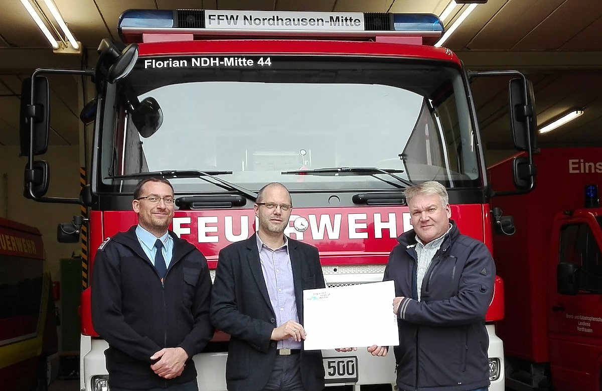 Zusätzlich überreichte Vorstand Holger Richter eine Spende in Höhe von 500 Euro an den Förderverein der Freiwilligen Feuerwehr Nordhausen-Mitte e.V. Mit diesem Geld sollen Teile der persönlichen Schutzausrüstung der Kameraden angeschafft werden. Die Spende ist als kleines Dankeschön dafür zu verstehen, dass die Mitglieder der Wehr während des Familienfestes Ende August auf dem Petersberg sowie bei der Mitarbeiterparty auf dem Gelände der Rothleimmühle für die Sicherheit der Gäste gesorgt haben.
