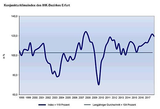 Im Ergebnis der aktuellen Konjunkturumfrage der Industrie- und Handelskammer (IHK) Erfurt unter rund 800 Unternehmen in Nord- und Mittelthüringen sinkt der Geschäftsklimaindex im Vergleich zur vorhergehenden Analyse geringfügig um drei Punkte und bleibt mit 119 von 200 möglichen Prozentpunkten auf einem hohen Niveau.