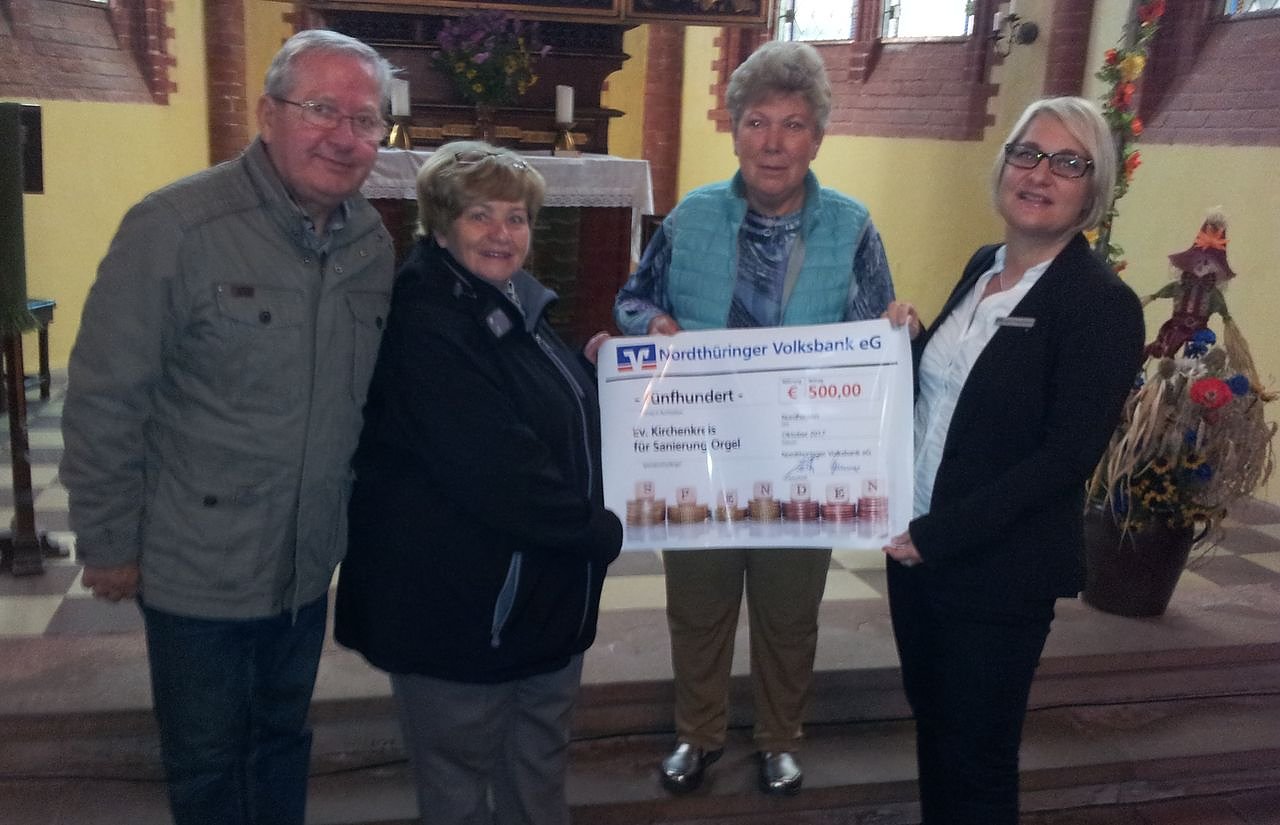 Jetzt erhielt die Kirchengemeinde auch Unterstützung von der Nordthüringer Volksbank. Frau Hirschelmann, Mitarbeiterin der Volksbank überbrachte Mitgliedern des Gemeindekirchenrates in Görsbach einen symbolischen Scheck in Höhe von 500 Euro für dieses Projekt. Die Görsbacher Kirchengemeinde bedankt sich ganz herzlich bei der Nordthüringer Volksbank für diese Spende.