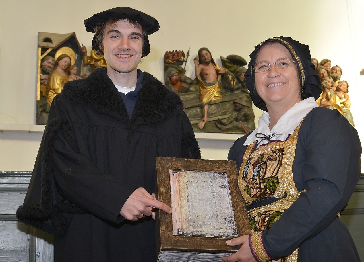 Seine letzte Predigt am gleichen Ort lag rund 500 Jahre zurück. Ob es damals schon Orgelmusik dazu gab, ist nicht überliefert. Dieses Mal ließ Michael Schoppe aus Berga die Königin der Instrumente für ihn und das Volk erklingen.