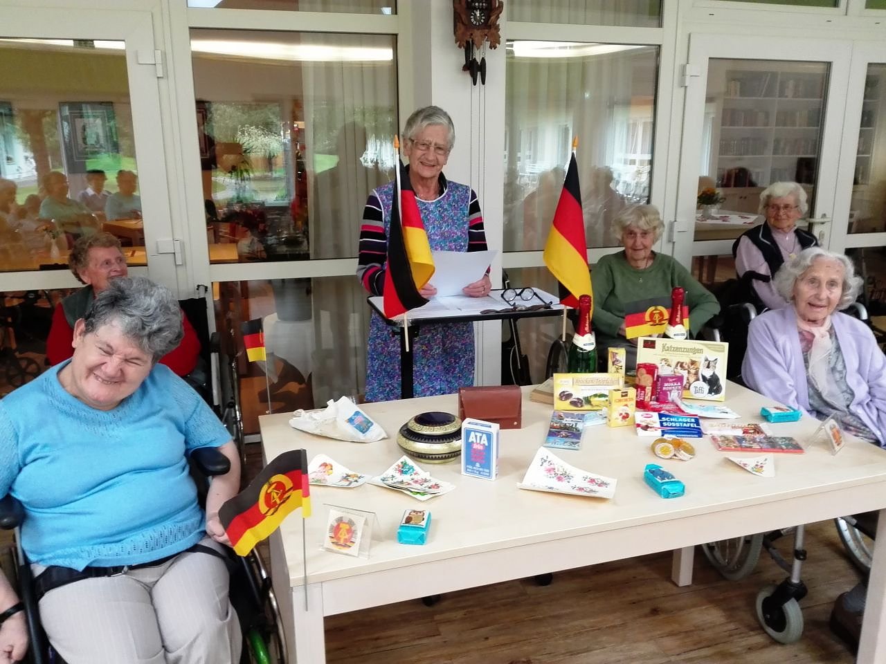 Zum 3. Oktober, dem Tag der deutschen Einheit, trafen sich viele Bewohner zu einer gemütlichen, nachdenklichen aber dennoch lustigen Runde im Sonnenstübchen des Sonnenhofs. Allerlei Köstlichkeiten boten sich dem Auge und anschließend dem Gaumen. Bekannte Haushaltswaren, Zahlungs- sowie Lebensmittel, vor allem Süßes erinnerte an die gute alte Zeit vor der Wende. Omas alte Beutchen oder Plätzchendose, die mit den Drops drin, das gute alte ATA wenn mal wieder gescheuert wurde oder original Kinderseife aus Riesa mit dem Elefanten drauf.Einige der in dieser Runde gezeigten sowie verköstigten Produkte regte zu vielerlei Gesprächen an. Natürlich durften ein paar Witze nicht fehlen welche von einer Genossin in Kittelschürze vorgetragen wurden. Nach einer Stunde voller Erinnerungen verabschiedete man sich wie Anfangs: Für Frieden und Sozialismus, seid bereit! Immer bereit!