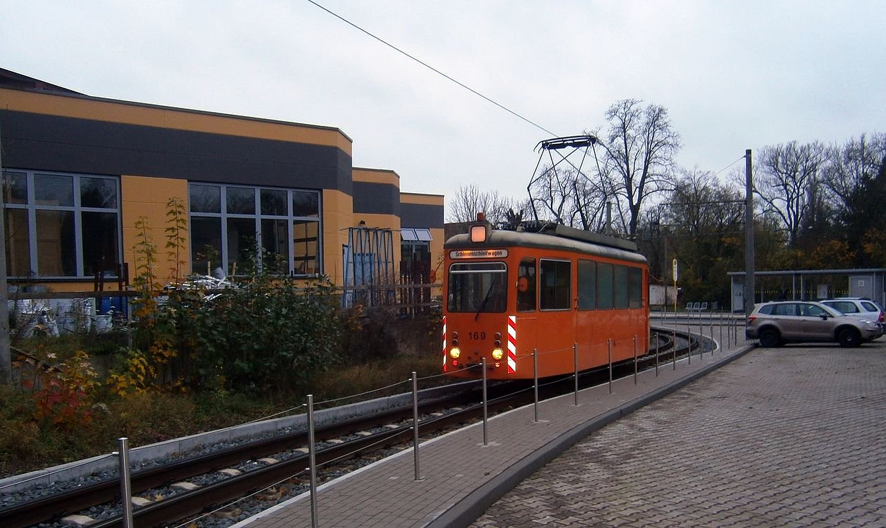 Viele Fahrgäste haben sich in den letzten Tagen bestimmt gefragt, was für eine unbekannte Straßenbahn auf den Nordhäuser Gleisen unterwegs ist. Die Antwort auf die Frage hat Fritz Keilholz, Betriebsleiter Straßenbahnverkehr bei den Nordhäuser Verkehrsbetrieben...Seit 24. Oktober 2017 ist ein Schienenschleifwagen vom Typ TW 2 der Halberstädter Verkehrs GmbH auf dem Streckennetz der Verkehrsbetriebe unterwegs. Der 10,50 m lange und 15,20 Tonnen schwere Wagen soll die Riffelbildung auf den Schienen beseitigen und somit entstehende Fahrgeräusche vermindern. Auch werden hierdurch die Fahrdynamik und die Reibungsverhältnisse verbessert, erklärt Fritz Keilholz.