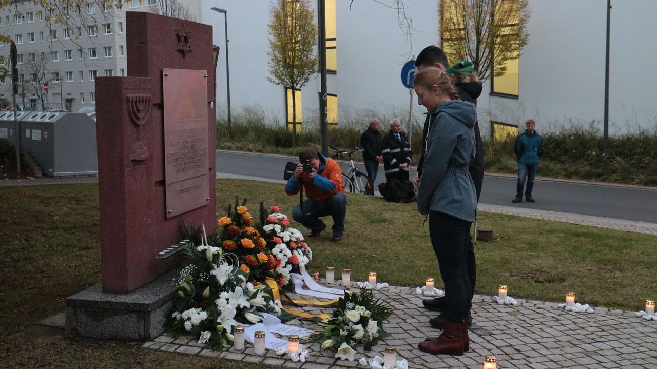 Kennen sollte sie jeder, die Geschichte der Reichspogromnacht auch wenn nur noch wenige da sind, die tatsächlich in diesen Tagen zugegen waren. Vieles wurde aufgeschrieben und ist auch heute, nach so vielen Jahren und nach so vielen Gedenkveranstaltungen, immer noch erschütternd. Schülerinnen und Schüler des Herder Gymnasiums waren es heute, die von ihnen zusammengetragene Zeitzeugenberichte vor dem Denkmal für die Nordhäuser Synagoge vortrugen, eindringliche Schilderungen die von Außgrenzung und Misshandlung, vom wegsehen, von Feigheit und Ohnmacht erzählen.