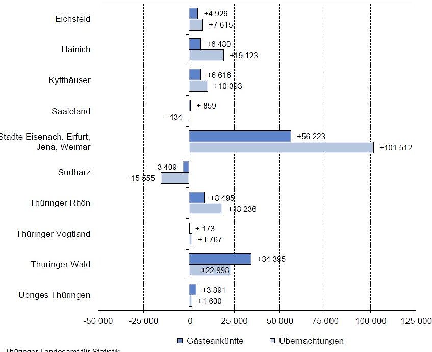 Im Städtetourismus (Eisenach, Erfurt, Jena und Weimar) konnte ein deut-licher Anstieg der Gästezahlen (+56 223) und der Übernachtungszahlen (+101 512) errechnet werden. Auch das größte Reisegebiet, der Thüringer Wald, konnte mit einem Gästeplus von 34 395 Besuchern und 22 998 Übernachtungen mehr ein sehr gutes Ergebnis erzielen. Bei den kleineren Reisegebieten konnten besonders die Regionen Kyffhäuser, Hainich und Thüringer Rhön punkten.