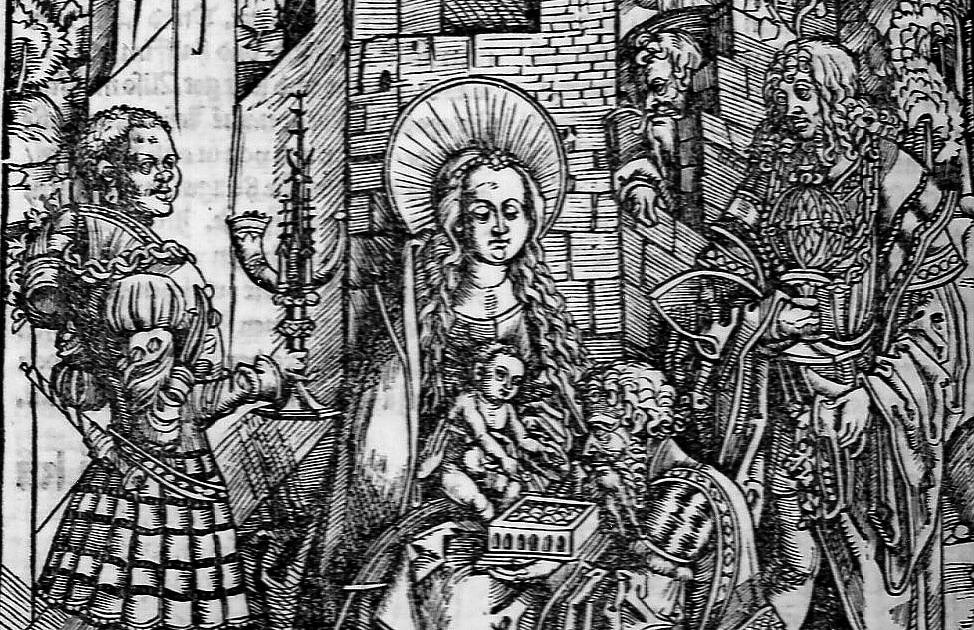 Das ausgestellte Blatt zeigt den Moment, als die Heiligen drei Könige im Stall zu Bethlehem mit ihren Geschenken erscheinen. Im Zentrum des Holzschnittes sitzt Maria mit dem Jesuskind wie auf einem Thron. Berge, Bäume und Architektur bilden den Hintergrund, am Dach des Stalles hat eine Spinne ihr Netz gesponnen. Eine reichhaltige Geschichte breitet der Künstler vor dem Betrachter aus. Auch in den anderen ausgestellten meisterlichen Blätter gibt es vielerlei zu entdecken. Lassen Sie sich in der Führung zum intensiven Schauen verführen.