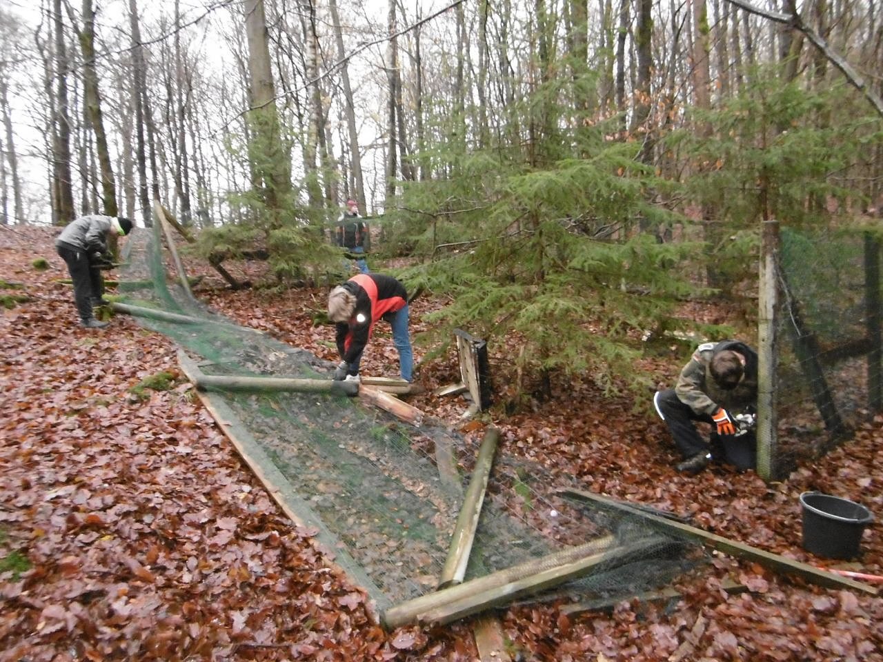 Dort war handwerkliches Geschick erforderlich, um den Maschendraht von den Holzsäulen zu trennen. Beide Teams arbeiteten mit viel Fleiß und Engagement. Während der Arbeiten konnte natürlich auch Interessantes aus der Natur, insbesondere zum Haselhuhn vermittelt werden.