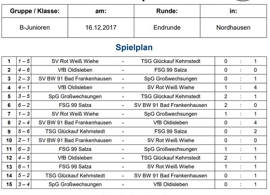 In einer spannenden Endrunde konnten vor dem letzten Spiel noch 3 Teams Sieger werden. Oldisleben konnte das letzte Spiel gegen Großwechsungen gewinnen und sicherte sich den Titel knapp vor den Mannschaften von der FSG 99 Salza und der SpG Großwechsungen.