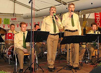 Nordhausen (nnz). Zur Tradition geworden ist der Auftritt des Thüringer Polizeimusikkorps auf der Südharzmesse. Seit dem es die Messe gibt, kommen die Musiker aus der Landeshauptstadt gern nach Nordhausen. Doch plötzlich gab es auch Gesang für die Messe-Besucher...Die Musiker spielten auf, um die Messebesucher mit flotter Marschmusik, Chansons, bekannten Volksliedern oder auch modernen Rhythmen zu erfreuen. Auch heute spielte die Blasmusikformation im Messezelt auf. Wie immer spielte sich das 1946 als "Landespolizeikapelle Thüringen" gegründete Orchester rasch in die Herzen des Publikums. Jürgen Herr, der Sänger des Klangkörpers, führte in alt bewährter Weise durch das Programm. Als der Titel "Mein Thüringer Land" angestimmt wurde, ließ es sich Thomas Soszynski, der Pressesprecher der Polizeidirektion Nordhausen, nicht nehmen, rasch ein zweites Mikrofon zu greifen und gemeinsam mit Jürgen Herr die "heimliche Thüringenhymne" zu singen.