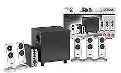 Mit dem neuen Trust SP-6300P 5.1 Speaker Set stellt Trust erneut Innovation und Stil in den Vordergrund. Das silbermetallicfarbene Lautsprecher-Set bietet 5.1-Surround-Sound. Die formgegebenen, schlanken Zwei-Wege-Lautsprecher bieten dank eines Trennfilters hervorragende Klangqualität. Mit dem 18-Watt-RMS-Subwoofer aus Holz und den fünf 3-Watt-RMS-Lautsprechern lässt sich mühelos ein Heimkino mit sensationeller Klangqualität einrichten. Das Lautsprecher-Set kann mithilfe der mitgelieferten Audiokabel problemlos an mehrere Geräte, z. B. einen PC mit Soundkarte oder einen DVD-Player, angeschlossen werden.
