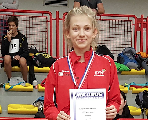 Silber errang Karolin von Glasenapp im Hochsprung in der Altersklasse W 13. Mit einer übersprungenen Höhe von 1,48 Meter verfehlte sie die Siegerhöhe von 1,51 Meter nur knapp. Die Glückwünsche zu Gold gehen hier an Chantal Rimke vom LV Altstadt. Eine weitere vordere Platzierung erreichte Karolin im Weitsprung. Mit Bestleistung von 4,47 Meter erreichte Karolin einen tollen 4. Platz. Dabei sprang Karolin die gleiche Weite wie die drittplatzierte, jedoch stand bei ihrer Konkurrentin der bessere 2. Versuch zu Buche.