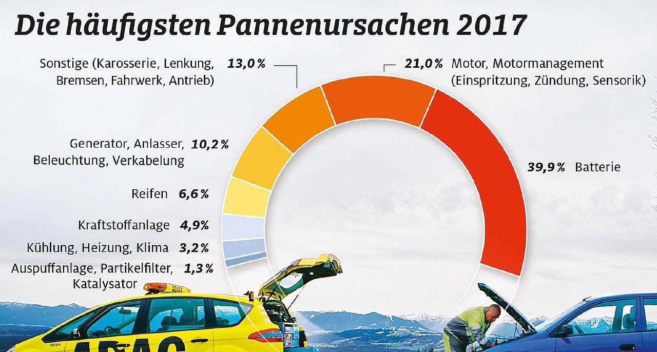 Pannenursache Nummer eins waren in knapp 40 Prozent aller Fälle Probleme mit der Batterie. Platz zwei der Gründe, die die Hilfe des Clubs erforderten, belegte das Motormanagement. Dazu zählt der ADAC vor allem Probleme mit der Einspritzung, Sensorik oder mit der Zündung. Mit 13 Prozent schlagen Pannen bei Lenkung, Karosserie, Bremsen, Fahrwerk oder dem Antrieb zu Buche.