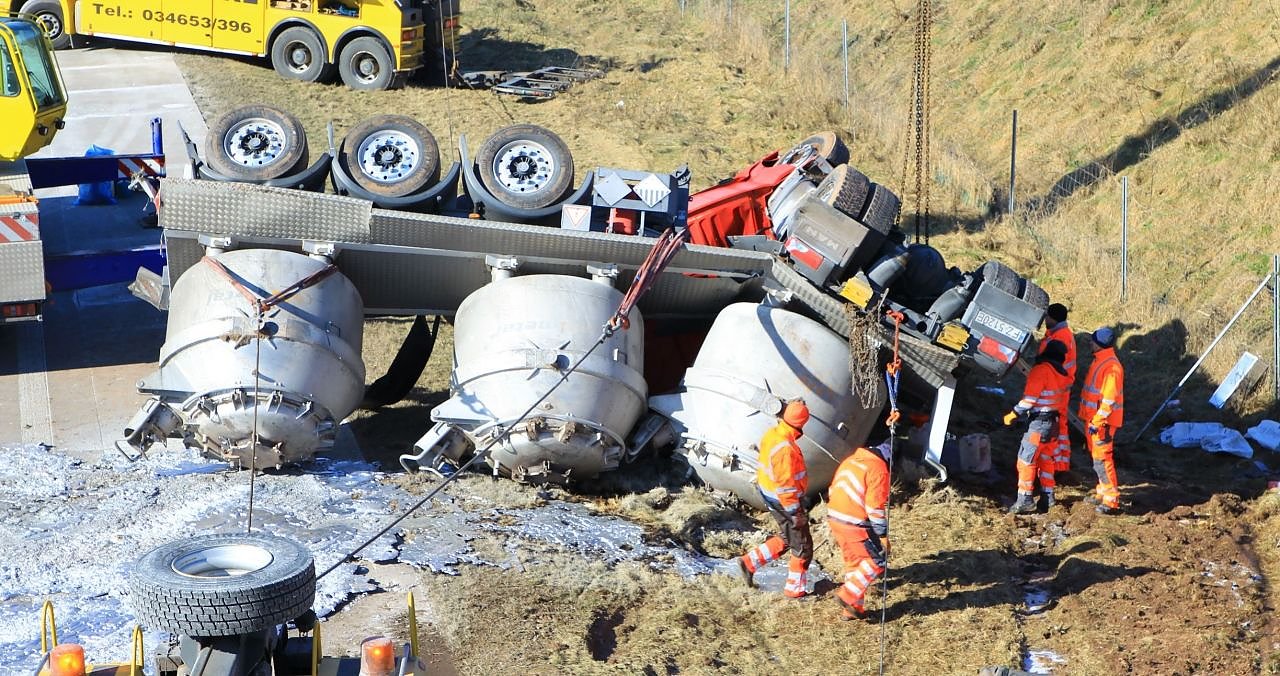 Mit schwerem Gerät wird versucht, den Lkw samt Ladung auf die Räder zu stellen. Das Fahrzeug soll dann sichergestellt und untersucht werden.