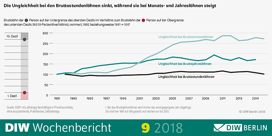 Der Blick der Ökonomen über die Stundenlöhne hinaus offenbart: Die Bruttomonats- und Jahreslöhne stiegen mit neun beziehungsweise fünf Prozent zwischen 1992 und 2016 nicht ganz so stark wie die Stundenlöhne. Die Abweichung erklärt sich zum einen damit, dass sich die monatliche Arbeitszeit verringert hat (zum Beispiel durch Kürzung von Arbeitgeberseite oder Wechsel in Teilzeit). Zum anderen schlagen in den Bruttojahreslöhnen Einmal- und Sonderzahlungen sowie Phasen der Nicht-Erwerbstätigkeit zu Buche.Vor allem im untersten Dezil sanken die Monats- und Jahreslöhne und liegen nur bei 50 beziehungsweise 60 Prozent des Niveaus von 1992. Entsprechend ist hier die Ungleichheit nicht zurückgegangen. Gemessen am 90:10-Perzentilverhältnis betrug der Faktor bei den Bruttomonatslöhnen 1992 knapp vier und ist bis 2010 auf mehr als zehn gestiegen, wo er seitdem stagniert – ein Anstieg von 170 Prozent (siehe Abbildung). Bei den Jahresbruttolöhnen ist er von acht im Jahr 1992 auf 13,6 im Jahr 2015 gestiegen (+ 70 Prozent).
