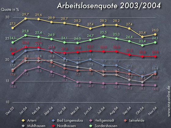 In der Agentur für Arbeit Nordhausen hat sich die Zahl der Arbeitslosen im Monat November 2004 auf 28.268 erhöht, das sind rund 480 mehr als im Oktober. Die Arbeitslosenquote bezogen auf alle zivilen Erwerbspersonen ist damit um 0,3 Prozentpunkte auf 18,6 Prozent angestiegen. Den größten Anstieg gab es dabei in der Geschäftsstelle Leinefelde. Insgesamt waren hier am Monatsende 5.617 Frauen und Männer arbeitslos, das sind 180 mehr als vor vier Wochen und rund 130 mehr als vor einem Jahr. In der Hauptagentur Nordhausen hat sich zwar die Zahl der Arbeitslosen gegenüber dem Vormonat um fast 40 und in Artern um fast 130 erhöht, im Vergleich zum Vorjahr ist sie aber deutlich niedriger. So konnten in der Hauptagentur rund 260 und in Artern fast 320 Personen weniger als vor einem Jahr registriert werden. In der Geschäftstelle Heiligenstadt verblieb die Arbeitslosenzahl im November auf dem Vormonatsniveau, insgesamt waren am Monatsende 2.892 Frauen und Männer ohne Arbeit, 104 weniger als vor einem Jahr.