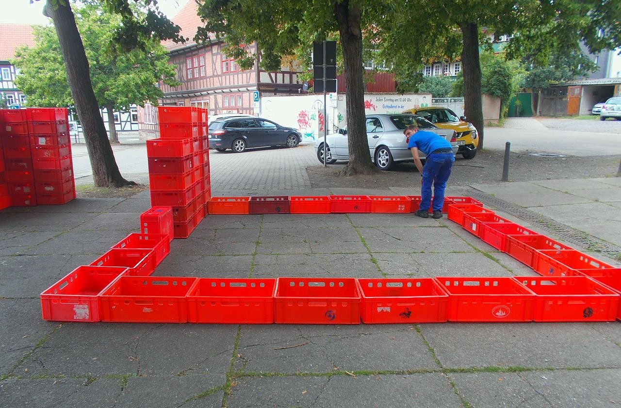 Bevor die Kisten im Keller des Pfarrhauses landen, wird bei dieser Gelegenheit erstmal auf dem Kirchplatz ordentlich mit den Kisten gespielt. Es wird ein Haus aus den Kisten gebaut, oder ein Labyrinth. Vielleicht gibt es auch keinen kleinen Wettbewerb, wer den höchsten Kistenturm zu Stande bringt?