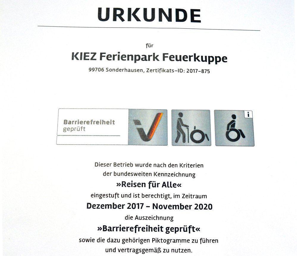 Ende vorigen Jahres erhielt der Ferienpark Feuerkuppe die Urkunde von der Thüringer Tourismus GmbH. Wir wurden nach den Kriterien der bundesweiten Kennzeichnung Reisen für Alle eingestuft und sind berechtigt die Auszeichnung Barrierefreiheit geprüft zu nutzen.