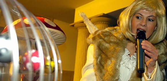 Die ehrenvolle Aufgabe, die Kugeln zu starten und zu stoppen, hatte Engel Simone vom Theater. Bis zu 25.000 Euro kann ein Glücklicher dank dieser Losziehung gewinnen. Von jedem Los gehen außerdem immer 10 Cent in den Topf für einen guten Zweck. Deshalb konnte die Sparkasse 1000,- Euro an den Förderverein des Theaters geben. Die Berthold Brecht Grundschule bekam 500,- Euro, nicht nur als Lohn für das heutige Weihnachtskonzert im Rahmen dieser Veranstaltung.