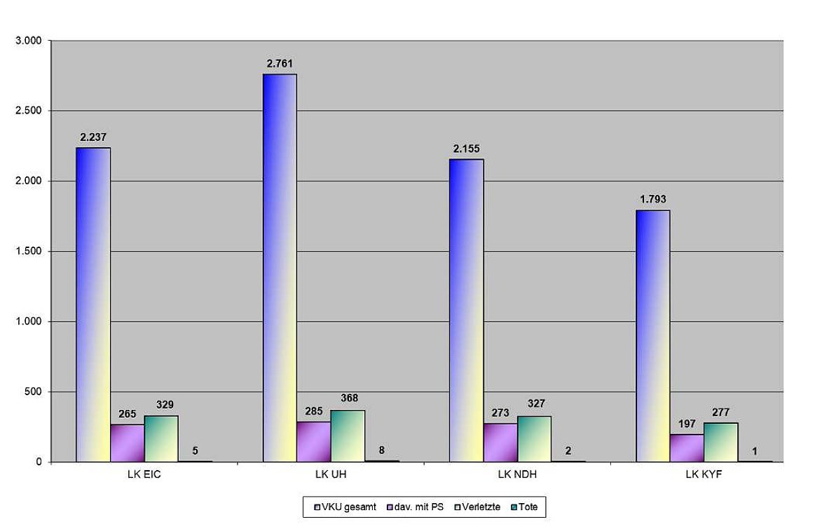 Die positive Unfallentwicklung in den letzten 10 Jahren hat sich 2017 nicht fortgesetzt. Es gab einen leichten Anstieg von 1,4 % in der Gesamtzahl der Verkehrsunfälle. Unfallschwerpunkte, die in den letzten Jahren auf den Bundesstraßen 4, B 81, B 85, B 247 und B 249 festzustellen waren, bedürfen weiterhin der Beachtung. Nur so können die Unfallzahlen immer mehr zurückgedrängt werden. Besonderer Aufmerksamkeit bedürfen dabei, außerorts, die- B 81, zwischen der Einfahrt Underberg bis Ufeld,