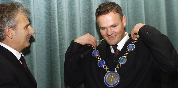 Nach einer Ansprache des Kultusministers war es dann so weit. Christian Juckenack mußte sich von seiner Rektorenkette trennen und sie an seinem Amtsnachfolger Jörg Wagner übergeben. Er wünschte ihm, daß er häufiger Gelegenheit haben werde dieses Schmuckstück zu tragen. Blumen und kleine Präsente für die alte und die neue Führungsmannschaft gab es ebenfalls.