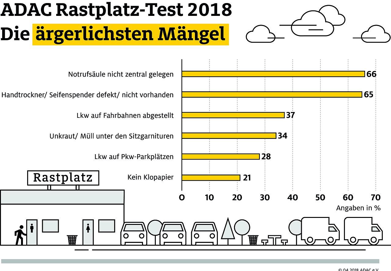 In drei Viertel der Fälle fanden die ADAC Tester eine mindestens ausreichend saubere und sichere Anlage vor. Zwar schnitt keines der 50 Testobjekte mit der Note sehr gut ab, 14 jedoch mit gut und 24 mit ausreichend. Nur acht Anlagen beurteilten die Tester mit mangelhaft, vier weitere allerdings sogar mit sehr mangelhaft. Kritik übten die Tester dabei vor allem am Fehlen von Seife, Handtrockner oder Toilettenpapier in den Sanitäranlagen.