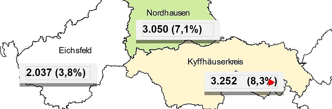 Im Kyffhäuserkreis sind derzeit rund 3.250 Männer und Frauen auf Jobsuche, fast 280 weniger als im Vorjahresvergleich. Die Arbeitslosenquote beträgt aktuell 8,3 Prozent. Vor einem Jahr lag die Quote noch bei 8,9 Prozent. Der Landkreis liegt damit unter dem Niveau von Bochum oder Bremen.Im Landkreis Nordhausen sank die Arbeitslosenquote zum Vorjahr um 0,2 Prozentpunkte auf 7,1 Prozent. Das Minus im Landkreis Eichsfeld lag bei 0,7 Punkten zum Vorjahr. Die Quote beträgt aktuell 3,8 Prozent.