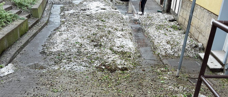 Wie hoch die Hagelkörner lagen, kann man an diesem Foto unseres Lesers Nico Sebert ermessen. Man hatte in dieser Straße das "Glück" mit am tiefsten Punkt zu liegen, wo sich die Hagelkörner ablagerten.
