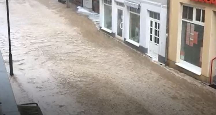 Der mit dem Unwetter einsetzende Hagelschlag hatte viele Blätter von den Bäumen gerissen und zusammen micht den vielen Hagelkörnern die Gullys verstopft, so dass die Kanalisation das Wasser garnicht aufnehmen konnte. Und so wurden die Straßen zu richtigen Flussläufen, welche die Hagelkörner mitrissen. Und da gerade in der Oberstadt die größten Wassermassen runter kamen, ergossen sich die verschiedenen Ströme an die tiefsten Stellen der Innenstand. Und an de Stellen, wo das Wasser zum Stillstand kam, liefen nicht nur die Keller voll sondern lagerten sich auch Unmengen an Hagelkörnern ab.