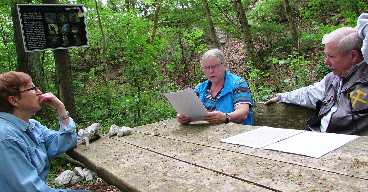 Autor: redAn der Eulenbank wurde ein Päuschen eingelegt, um über den Abbau und die Verwendung des Schönen Mädchensteins, in einstiger Zeit, zu fachsimpeln. An diesem verwunschenen Ort einfach mal innehalten, dem Wind in den Baumkronen lauschen und die Seele baumeln lassen fiel den Wanderfreunden nicht schwer.