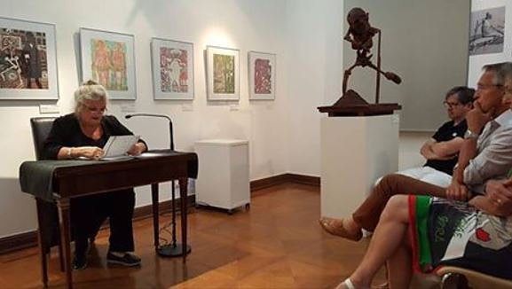 Allerdings erforscht es auch die Themen der Tiefen der Mängel im menschlichen Geist, einschließlich der Kämpfe mit dem Alkoholismus, die Gefahren der häuslichen Gewalt und das endgültige Urteil, das den abscheulichsten Sünden folgt. In der Pause zwischen den Lesungen, die eigentlich keine wahre Pause war, wandelte Susanne Hinsching die Zuhörer zu Betrachtern, in dem sie unter anderem das Bild erklärte, das den Anlass, die Initialzündung zu dieser Ausstellung gab - Max Klingers Amor, Tod und Jenseits.