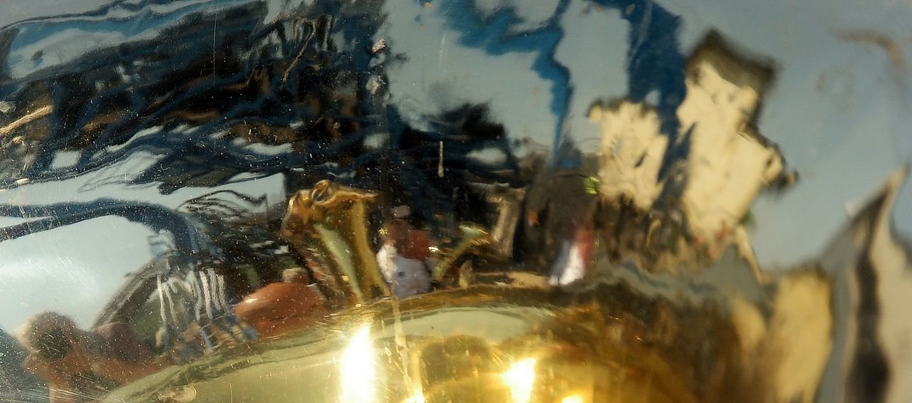 Das, was Sie auf diesem Bild hier sehen, ist das neue Wahrzeichen von Sondershausen. Etwas verzerrt durch das golden glänzende Blech einer Tuba des Bergmannsorchesters. Es zeigt das neue Fördergerüst des Schachts 5 der GSES.