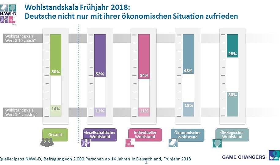 Der Ipsos NAWI-D misst die Zufriedenheit der Deutschen mit verschiedenen Faktoren, die sie selbst als Voraussetzung für Wohlstand ansehen. Mit ihrer ökonomischen Situation sind 48 Prozent der Deutschen sehr zufrieden, 34 Prozent relativ zufrieden und 18 Prozent sehr unzufrieden. In die Berechnung fließen beispielsweise die Einstufung zur Arbeitsplatz- und Einkommenssicherheit, zum Besitz von Eigentum sowie Vorsorge- und Konsummöglichkeiten ein.