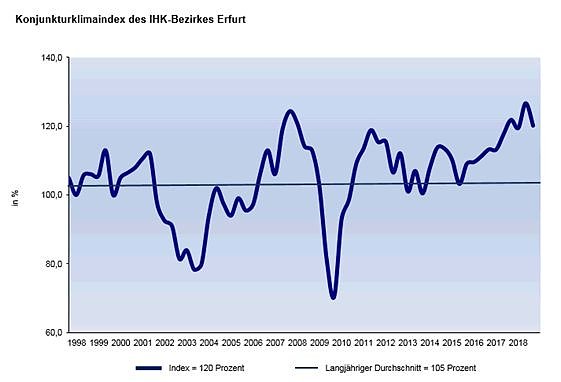 Im Ergebnis der aktuellen Konjunkturumfrage der Industrie- und Handelskammer (IHK) Erfurt unter rund 800 Unternehmen in Nord- und Mittelthüringen sinkt der Geschäftsklimaindex um sieben Punkte und erreicht nun 120 von 200 möglichen Prozentpunkten. Mit einem Wachstumseinbruch muss jedoch nicht gerechnet werden. Die Wirtschaftsentwicklung steht auf einem starken Fundament. Exporte und Inlandsnachfrage bewegen sich weiterhin auf einem hohen Niveau.