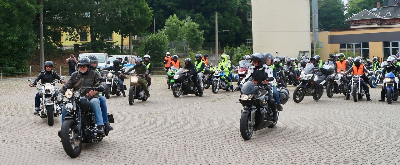 Heute wurde in zwei Gruppen gefahren, von Nordhausen aus ging es in Richtung Eichsfeld. Hier sollte am Baumkronenpfad Halt gemacht werden. Nach der Pause führt die Tour entlang der Hainleite zum Affenwald und wieder zurück. "Für die Jugendlichen ist das ein richtiges Highlight, die finden das cool und für uns ist es schön etwas soziales tun zu können", erzählt Grit Wiegleb, mit ihrem Trike ist sie von Anfang an dabei. Manche der Beifahrer haben dabei noch nie auf einem Motorrad gesessen und sind aufgeregt bevor es endlich losgeht. "Das hat sich am Ende des Tages gewandelt", sagt Sylvia Spehr, "die Fahrt ist auch dazu da, den Kindern Mut und Vertrauen zu geben und das funktioniert super.