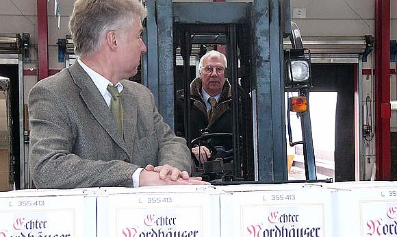 Seit kurzem mittels PC. Das alles nennt sich Chargen-Rückverfolgungsystem. Da stehen die Paletten mit Mariacron, Sekt oder dem Echtem Nordhäuser ordentlich ausgerichtet in Reih` und Glied. Oben drüber hängt ein Strichcode, der mittels Laser abgelesen wird. Vom Eingang der Ware bis zum Verlassen der 15.000 Quadratmeter Hallenfläche wird nichts dem Zufall, sondern einem schlauen Rechner und erfahrenen Leuten überlassen. Das Lagersystem ist das Feinste, was derzeit auf dem Markt zu haben ist, mit ihm können die einzelnen Chargen rückverfolgt werden. Eine Forderung die sowohl der Handel als auch die EU aufgemacht haben und der sich Nordbrand und Blanke gemeinsam gestellt haben. 500.000 Euro haben sich die beiden Unternehmen die neue Technik kosten lassen, seit 1990 hat Manfred Blanke allein in die baulichen Hüllen in der Südstraße runde 11 Millionen Euro investiert. Er hat damit nicht nur seinen Mitarbeitern und Azubis Arbeitsplätze geschaffen, er hat auch Aufträge für die hiesige Bauwirtschaft ausgelöst.