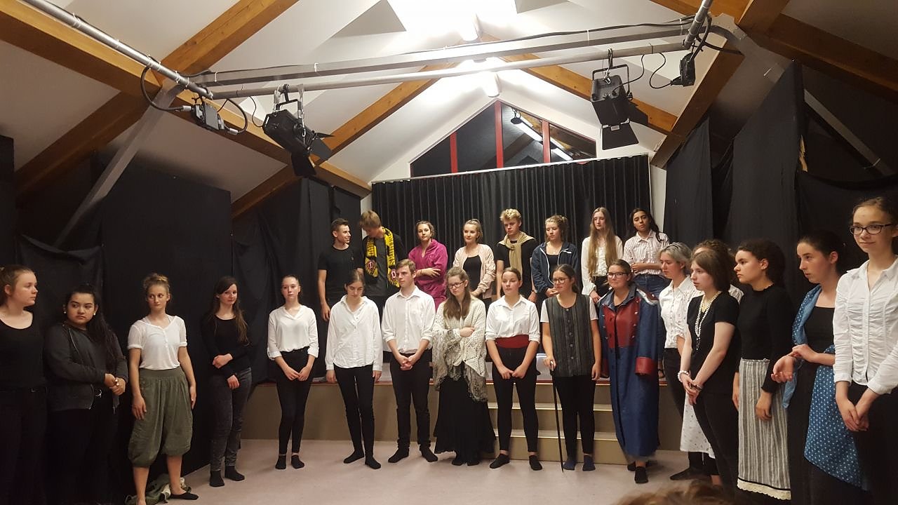 Der letzte große Auftritt vor Familien und Freunden wurde umrahmt von einer Ausstellung mit selbstgestalteten Plakaten zum Werk. Trotz Saunatemperaturen vor, hinter und auf der Bühne sowie dem anfänglichen Lampenfieber der Darsteller wurde die Aufführung ein Erfolg und vom Publikum mit kräftigem Applaus belohnt.