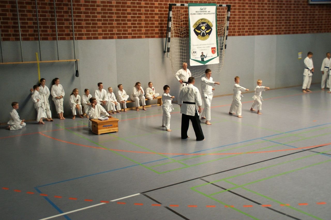 Den Anfang machte die Trainingsgruppe der SaCO-Selbstverteidigung. Bereits am vergangenen Mittwoch stellten sich gleich 12 Prüflinge den kritischen Augen der Meister. Neben Grundtechniken und vorgegebenen Formen wurde auch Basiswissen in Rechtskunde abgefragt.