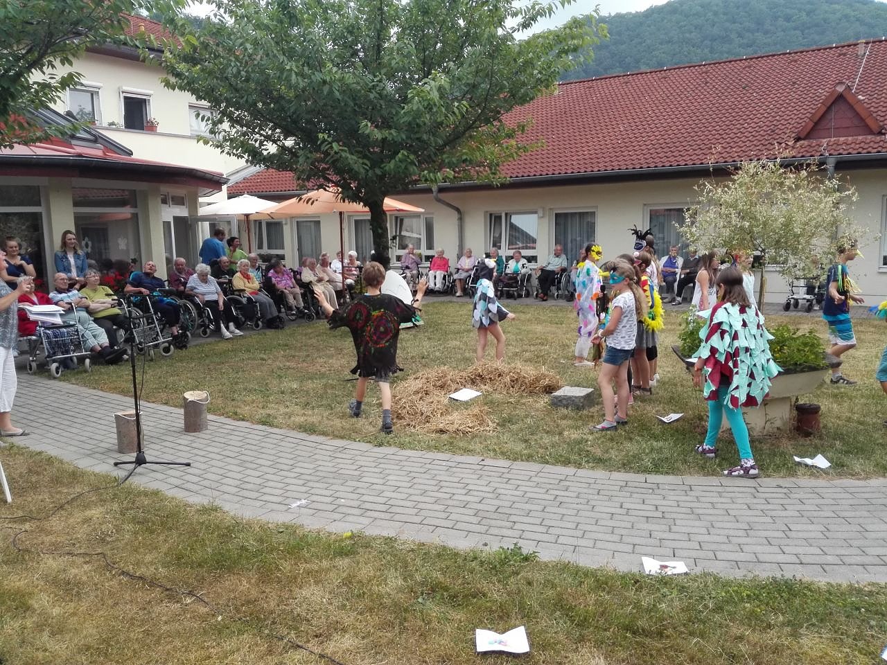 Ein Vogel wollte Hochzeit machen, in dem grünen Walde…Wer kennt nicht dieses Lied welches ca. 1470 entstand, zu den traditionellen Volksliedern gehört und nicht nur einer bestimmten Region zugehörig ist. Weitverbreitet genug um es allen Ortes anzustimmen und mitzusingen. Der Ilfelder Schulchor begeisterte die Bewohner des Sonnenhofs am Mittwoch, dem 13. Juni mit Rolfs Vogelhochzeit im Garten des Innenhofs. Bunte Kleider, tolle Accessoires, selbstgebastelte Requisiten und das volle Programm welches der Feder Rolf Zuckowskis entspringt, hatten die Kids unter der Leitung von Jana Winter zusammengetragen und einstudiert. Bei wenig Sonne aber dafür angenehmen Temperaturen genossen die Bewohner das bunte Treiben, klatschten und sangen bei dem bekannten Lied der Vogelhochzeit mit.