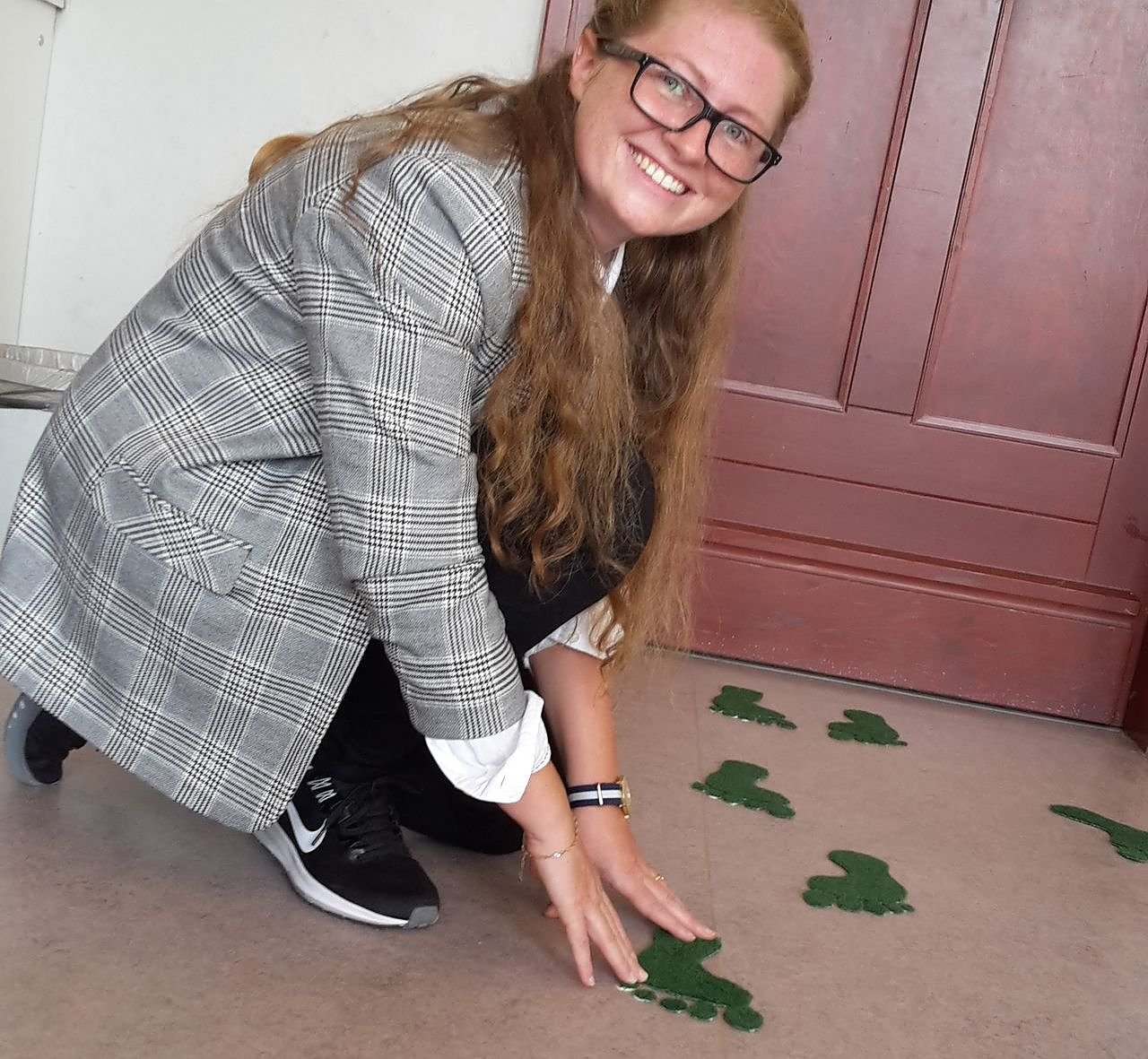 Anna Medzech befestigt zahlreiche grüne Fußabdrücke, die den Teilnehmern symbolisch ihre eigenen Fußabdrücke, den sie auf der Erde hinterlassen, vor Augen führen und stellt folgend ihre Klimadetektive für den Fachbereich Mensch-Natur-Technik vor
