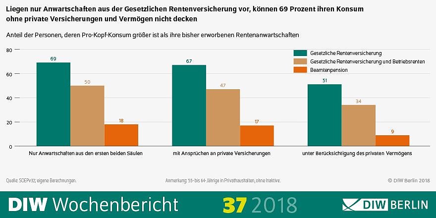 Die ÖkonomInnen sind der Frage nachgegangen, inwieweit die drei Säulen der Alterssicherung bestehend aus gesetzlicher, betrieblicher und privater Vorsorge ausreichen, den Konsum der Erwerbstätigen aus rentennahen Jahrgänge zu decken, wenn diese jetzt in den Ruhestand gingen. Dazu wurden Daten des Sozio-oekonomischen Panels (SOEP) von 2012 zu Rentenanwartschaften, Vermögen und Konsum der Geburtsjahrgänge 1948 bis 1957 ausgewertet. Gut die Hälfte der Personen aus diesen rentennahen Jahrgängen müsste im Ruhestand ihren privaten Konsum einschränken, da ihre Rentenanwartschaften nicht ausreichen würden, den aktuellen Konsum zu finanzieren, schließt Studienautor Markus M. Grabka aus den Ergebnissen.